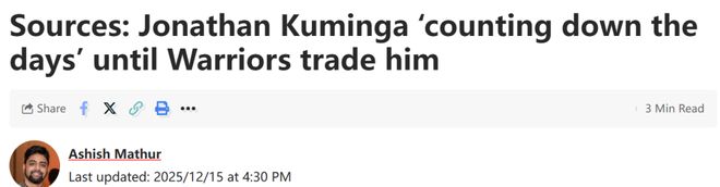 北京时间12月16日,据NBA记者Mathur报道,消息源透露,乔纳森-库明加正在掰着手指头倒计时,盼着金州勇士队将自己交易离队。